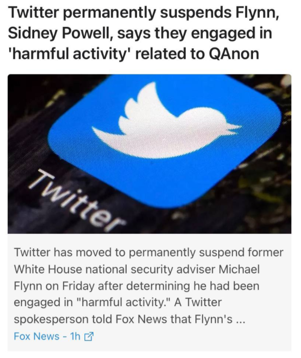 福林、悉尼·鲍威尔(Sidney Powell)被推特施以传播右翼谣言网站QAnon的罪名,给永久停号。同样被删除的还有众多川粉号。