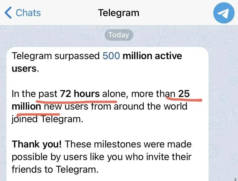 答案可以是过去72小时之内,就增加了2500万用户,总用户数量突破5亿人的电报(telegram)。