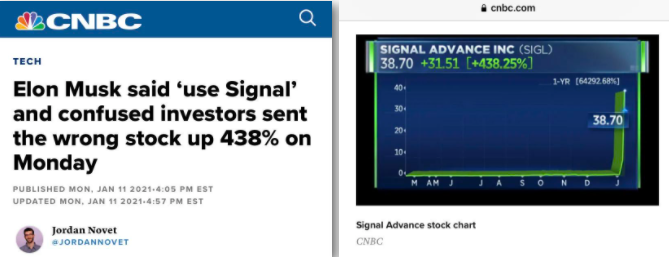 与此同时,首富马斯克发了一个“用Signal”的推特,让一家与此同名的公司中彩了,周一一天股价意外收获438%的增长。
