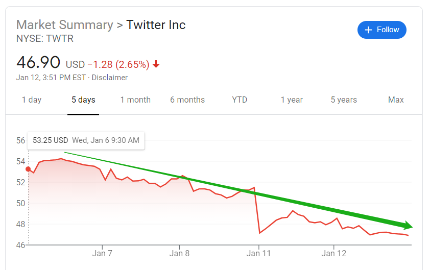 看看这几天推特的股价,持续下跌,尤其在周末搞蓝色大封锁,注销川普和其他至少7万个推特账户之后,周一一开盘,这两天之内股价已经下跌近10%。