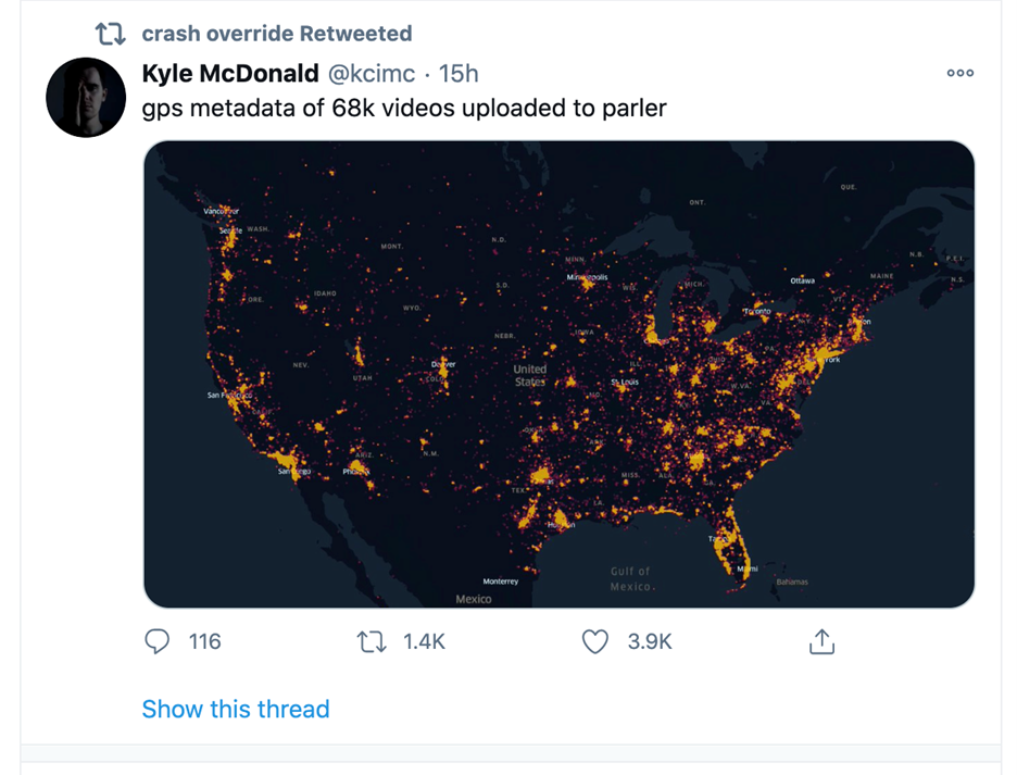 就在数据公开之后,各种各样,抱着不同目的的人已经开始把玩数据(比如有人利用gps的数据绘制了部分美国parler用户的地理分布)。而在这些人中,我们无法知道会否有一些别有用心之人滥用数据。