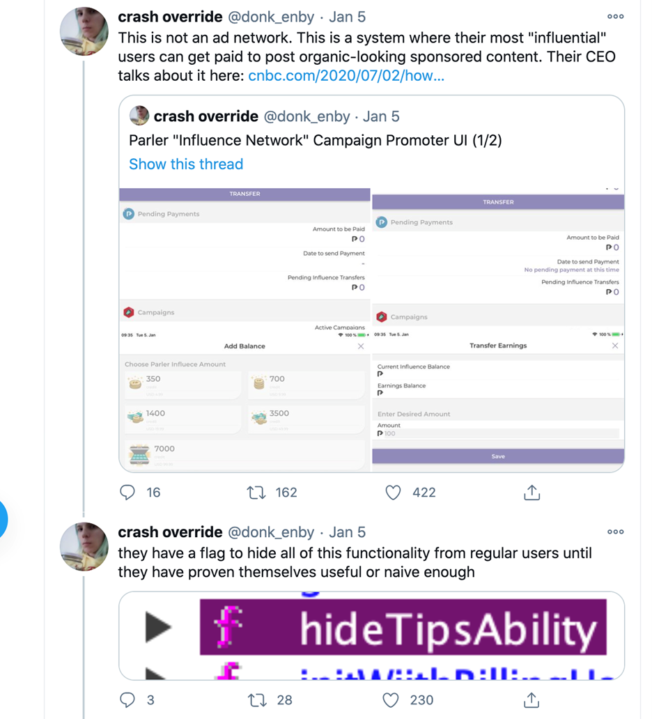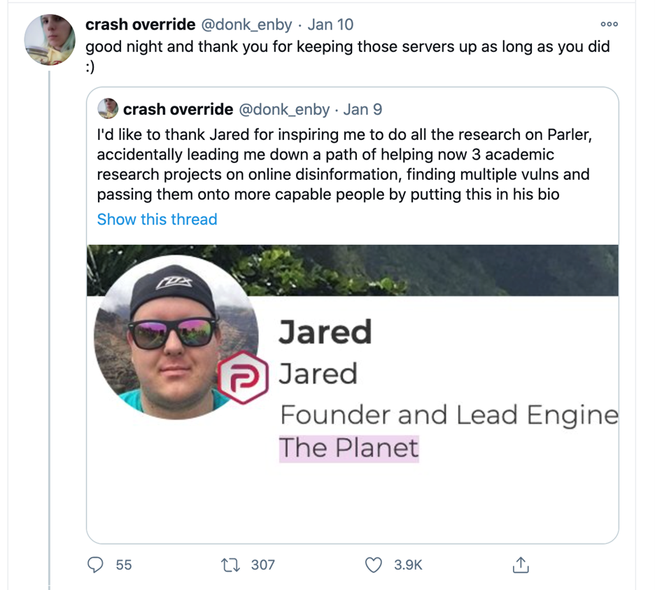 结合这些信息看,donk_enby并不是因为1月6号的事情,义愤填膺,一举攻下Parler,她一直都在从事针对的Parler api的攻击,只是恰巧碰上了1月6号的事情。