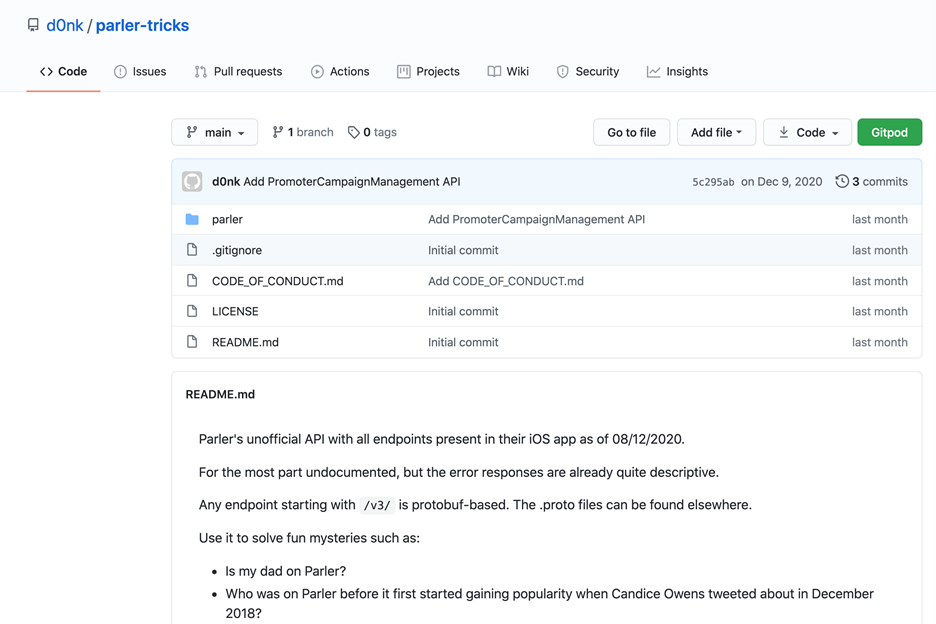 截至我写这篇文章的时候,donk_enby已经将个人网页(https://donk.sh/)下架,但从我之前在她个人网页上顺藤摸瓜,找到了github上她反编译后获得的Parler非官方api的python脚本。从最后一次修改时间来看是12/09/2020。