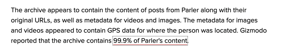 而这些数据中包含了parler上近99.9%的数据,包括各种用户的帖子,图片,录像,甚至GPS的数据。拥有这些数据的人是可能复原出很多Parler用户的个人信息和家庭住址的。