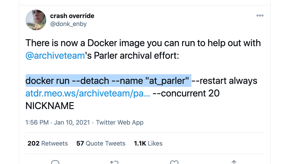 由于使用docker,很多完全不需要懂黑客知识的人,只要在自己电脑的命令行里,输入一段简单的指令,就可以帮助下载Parler数据。由于很多人的响应,大量的Parler数据被最终下载下来。