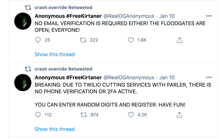 然后时间点来到6号以后的10号,Parler的用户验证提供商Twilio宣布,他们将关闭Parler的service,从而使用户无需验证也可以访问Parler的数据。这彻底打开了Parler的数据访问权限。