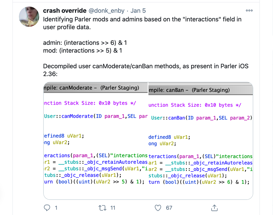而且donk_enby将Parler和反编译api和甚至获得数据公开了,这意味着别人可以在将来用更低的成本模仿她已经做的事情。