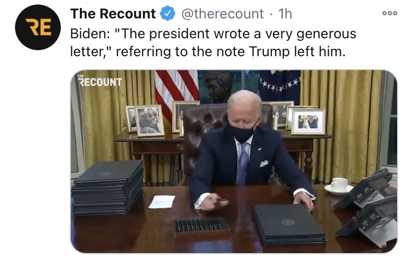 川普按照自己一早的放话,果然缺席了今天的总统就职典礼,美国历史上这样的情况只有少数几次。不过川普按照传统给拜登留下了一份亲笔信,尽管网上已经有无数PS恶搞的版本,但是根据拜登亲诉,写得“非常宽厚(a very generous letter)”,只是私人信件目前不会公布。
