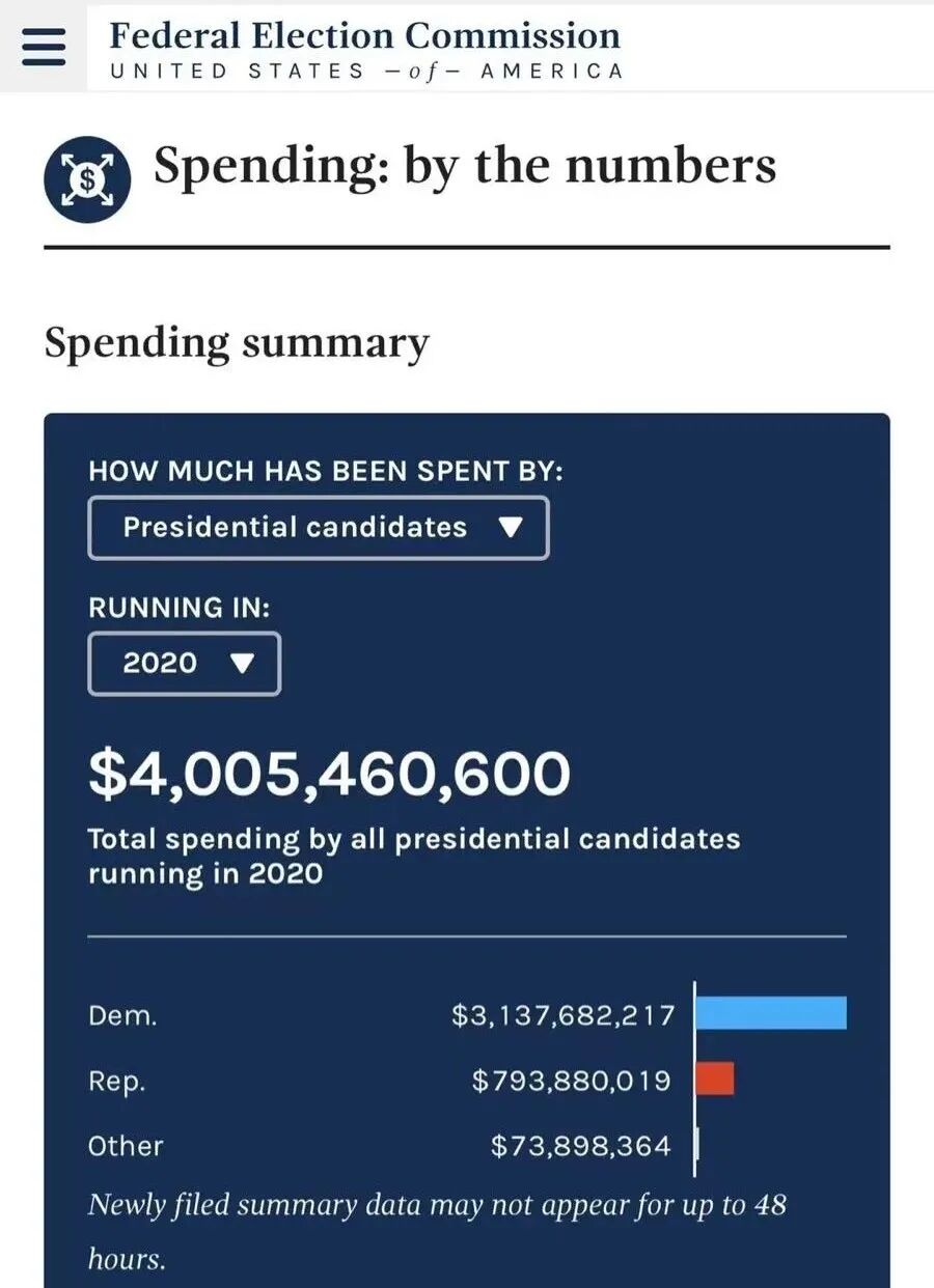 根据来自联邦竞选委员会的统计,美国过去几届大选,两党投入差距并不大,总体花费一般在15亿美元之间。2020年非常不一样,这个选举周期中一共花费40亿美元,其中民主党花了31.4亿,共和党花费7.9亿。
