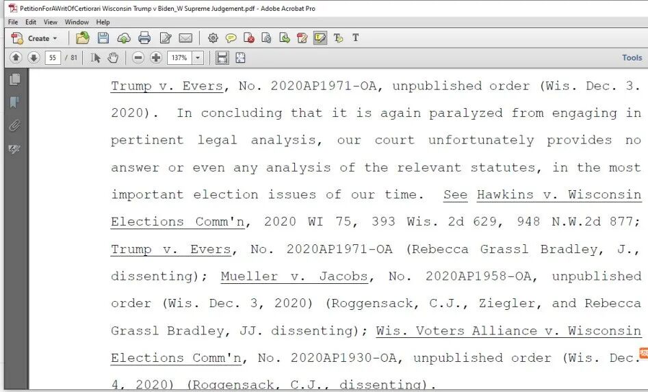 这个案件是川普和彭斯等在Wisconsin提起的起诉拜登和贺锦丽及威州一些选举委员会等案(Donald J. Trump, Michael R. Pence, and Donald J. Trump for President, Inc. v Joseph R. Biden, Kamala D. Harris, Milwaukee County Clerk c/o George L. Christenson, Milwaukee County Board of Canvassers c/o Tim Posnanski, Wisconsin Elections Commission, Ann S. Jacobs, Dane County Clerk c/o Scott McDonell and Dane County Board of Canvassers c/o Alan Arnsten),以下我们就称它川拜案吧。