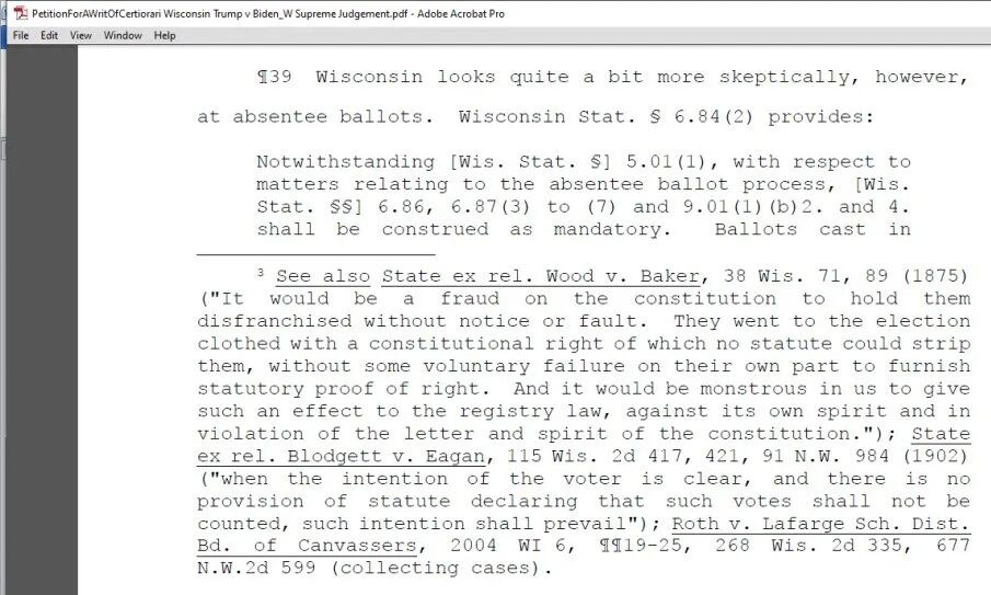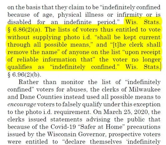 原告向联邦最高法院递交的上诉文件中陈述,威州法律规定,“应制作一份‘不定期受限’选民的名单,并及时更新,收到某位选民不再属于‘不定期受限’的可靠消息后,职员应将其从名单中去除。”我没有去核实这条法律条文,但鉴于它是律师在向法院递交的正式法律文件中引述,应当不太会有问题。(上诉书可在最高法院官网查看:https://bit.ly/3qAIoLS)