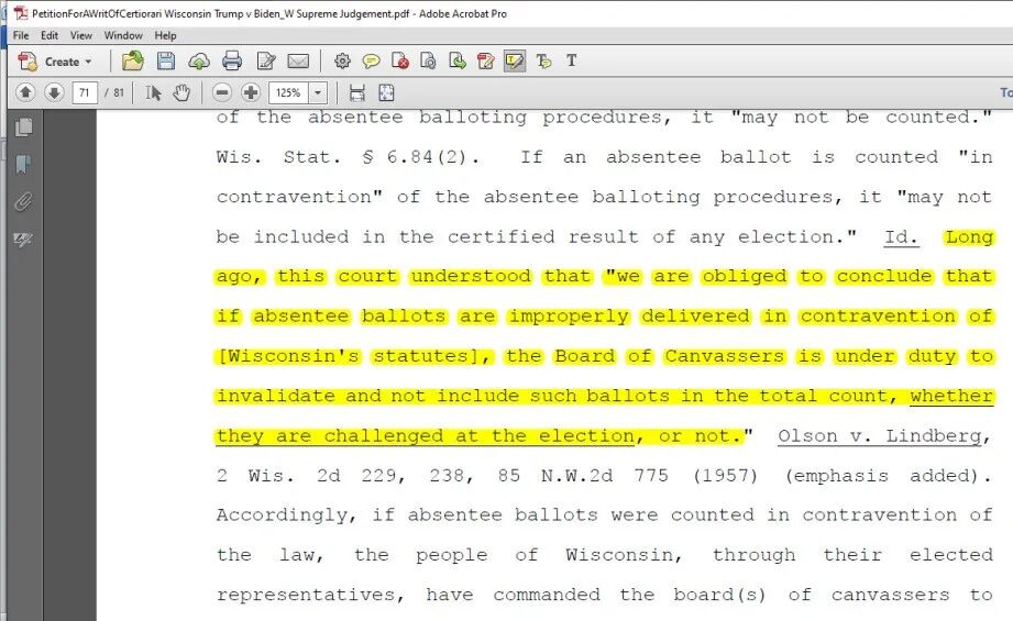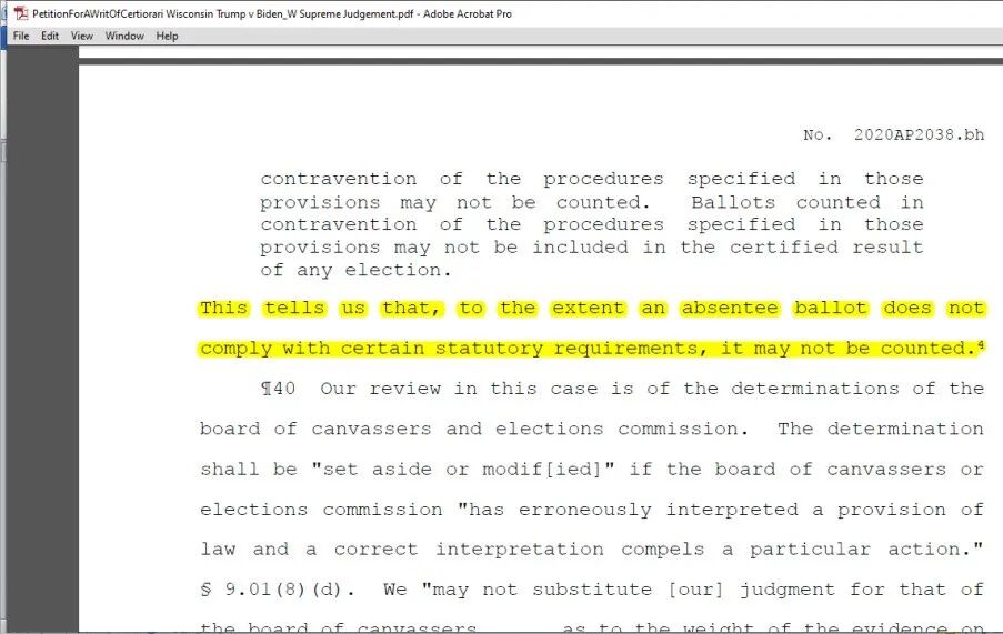 管理选举的机构有义务将违反程序的选票剔除,无论是否受到法律挑战,而威州法院曾有若干先例判决违反程序的选票不予计入(尽管多数判决未提及这一点,一位持多数意见的法官在其协同意见中,也陈述威州法律的确对缺席选票程序要求严格,法律对其的程序性要求为强制性,违反强制程序的选票不得计入);