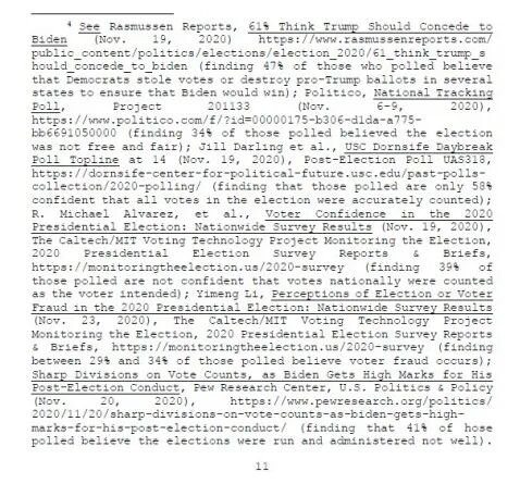 美国法官们写的意见不囿于纯粹的法律分析,往往还会阐述法官的信念,以帮助解释为什么做出某种认定或决定。例如一位法官就引用了六个民调数据(显示29%-47%的被调查者相信本次总统选举不公正),说明清晰阐释法律、回应公众顾虑的重要性。