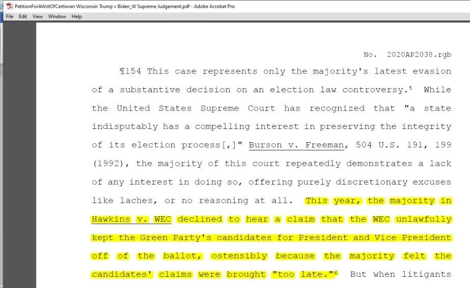 法庭的职责在于阐明法律的含义、进行法律分析、为本次也为将来的选举确定某些行为合法或不合法,不应把“原告懈怠”当作挡箭牌不作司法决定(并指出威州高等法院屡屡以懈怠来推脱与本次总统选举有关的案件至少五件,包括大选之前拒绝绿党推举的总统和副总统候选人);