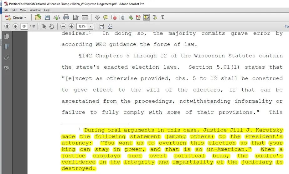 此外值得注意的是,Rebecca Grassl Bradley法官记录,在口头审理过程中,一位多数意见的法官如此对原告律师说:“你们想让我们推翻选举结果,好让你们的王继续掌权,这太不美国了。”