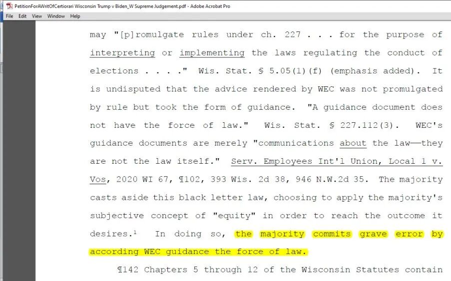 威州选举委员会的指南不是民选立法者制定的法律,如果与法律冲突,必须以法律为准,政府机构只能执行法律而不能立法,多数判决错误地认为指南是法律。