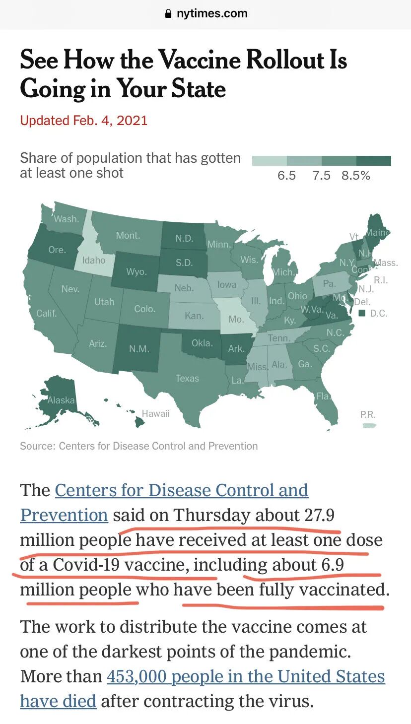 美国已经治疗了近千万新冠患者,医疗经验和药物选择比疫情初期改进了很多。而现在美国打上至少一针疫苗的人数(2790万人,即8.5%的人口)已经超过了感染新冠的累积人数(2727万人),其中690万人完成了2剂疫苗的注射。