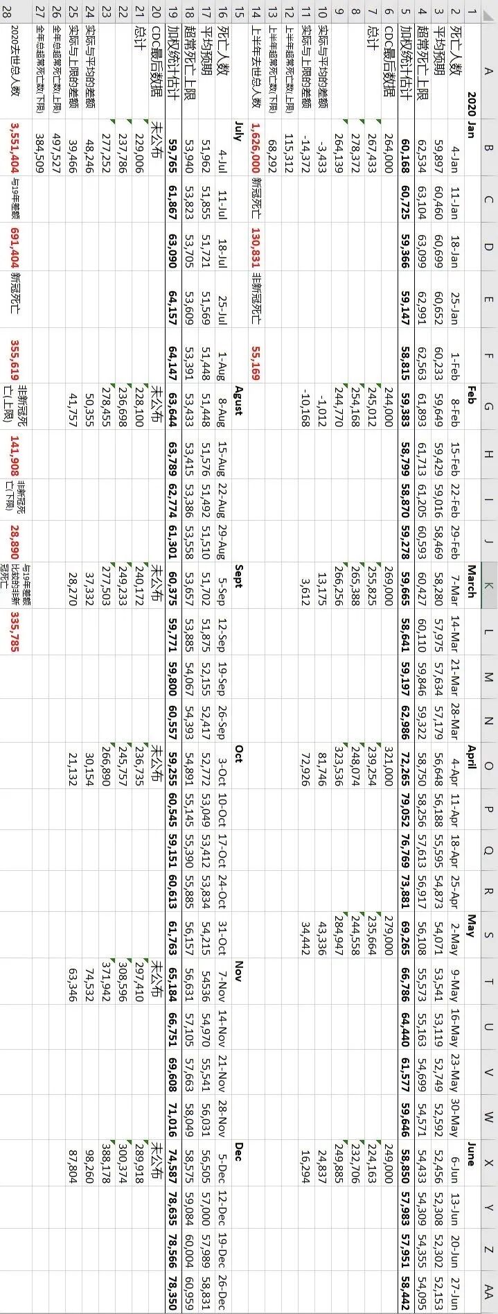 将这些数据叠加可以得出,2020年美国总计去世355万人(其中1-6月为CDC重复校正过的数据,7月-12日为CDC每周统计数据直接相加;参考excel图中B28格的数据,以及【1】)。