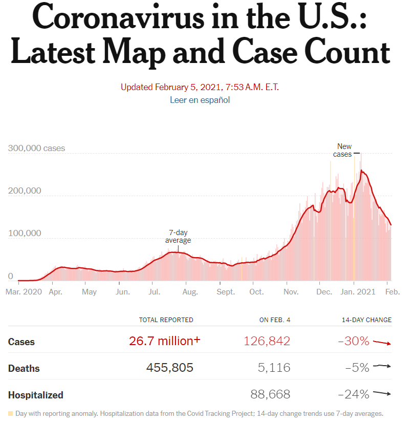 随着疫苗的推进和春天的到来,美国每7日平均病毒感染数据相较今年1月初的“恨天高”状态,回落了40%以上。