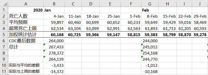 具体到2020年每个月来看,美国在去年1-2月的时候,死亡人数并无异常增加,反而每月比往年同期平均预期还少去世几千到1万余人(下图中B10, B11, G10, G11)。