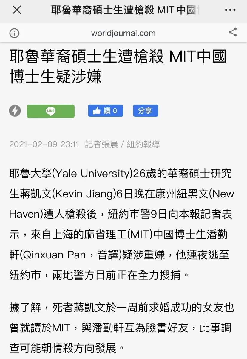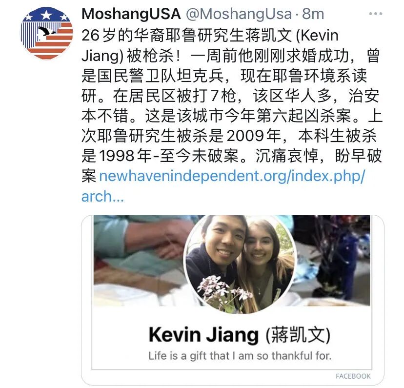 2月6日晚上8:30分,华裔年轻人蒋凯文(Kevin Jiang)在耶鲁大学附近的公寓探望未婚妻后,离开途中,身中八枪被杀!