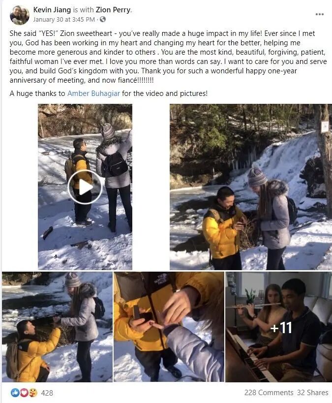 两人于一年前的1月,相识于位于康纳狄格州诺沃克的一个教堂。在麻省理工学院(MIT)读大四的佩里承受着毕业季的压力,去这里散心。教会静休活动建议为相邻的教友彼此祈祷,凯文与她恰好坐在邻位,神引导的缘分,本是妙不可言。