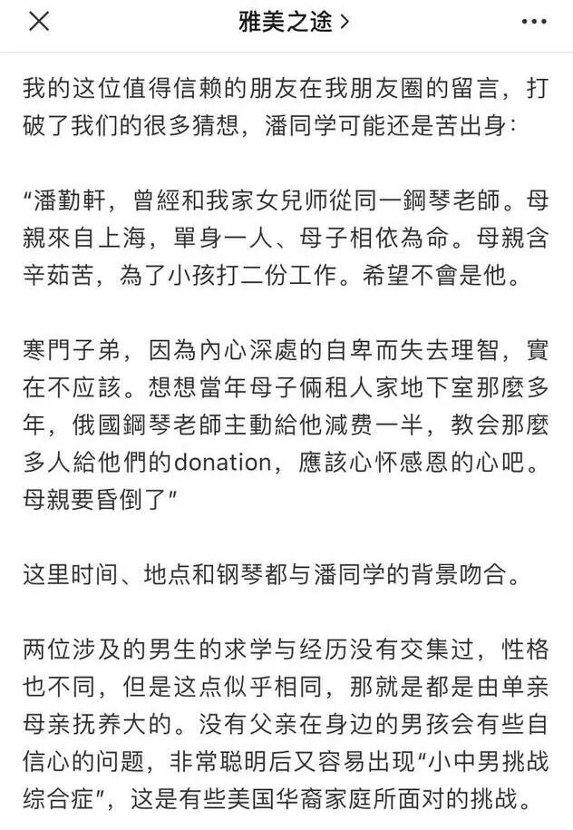 之前我们只知道一位不幸的单亲妈妈。网上流传着一些关于潘勤轩家庭的传闻,但是公号“雅美之途”在《MIT涉嫌凶手也是苦出身?》一文中却给出来意想不到的信息: