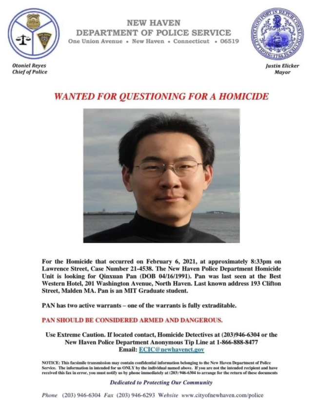 潘勤轩成为美国警方在地方、康州甚至全美搜捕的对象。