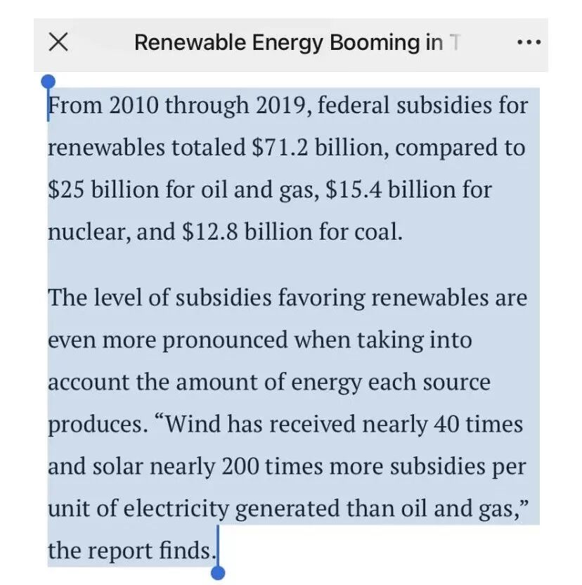 由此自然带来成本问题。现在美国同样发一度电,对风能的补贴已经是传统能源的40倍,对太阳能的补贴更是200倍。此外拜登已经签署总统令,进一步消减对传统能源的补贴。这意味着绿色能源占到更高比例的话,等于是以更惊人的速度对电费涨价。