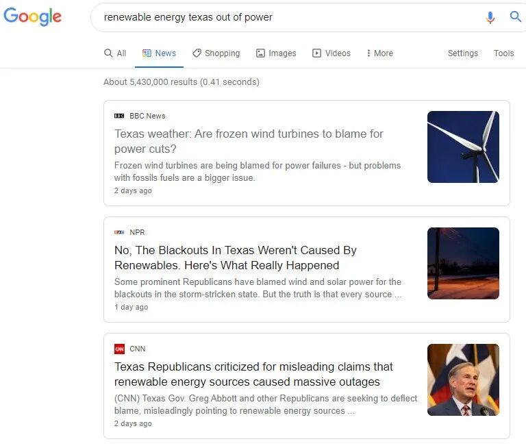笔者先用很中性的几个关键词“可再生能源、德州、停电(renewable energy Texas out of power)”输入谷歌搜索,出来结果第一版全部都是为绿色新能源站台、批评保守派攻击新能源是“阴谋论”、指责德州共和党利用这个作为机会甩锅新能源之类的文章。