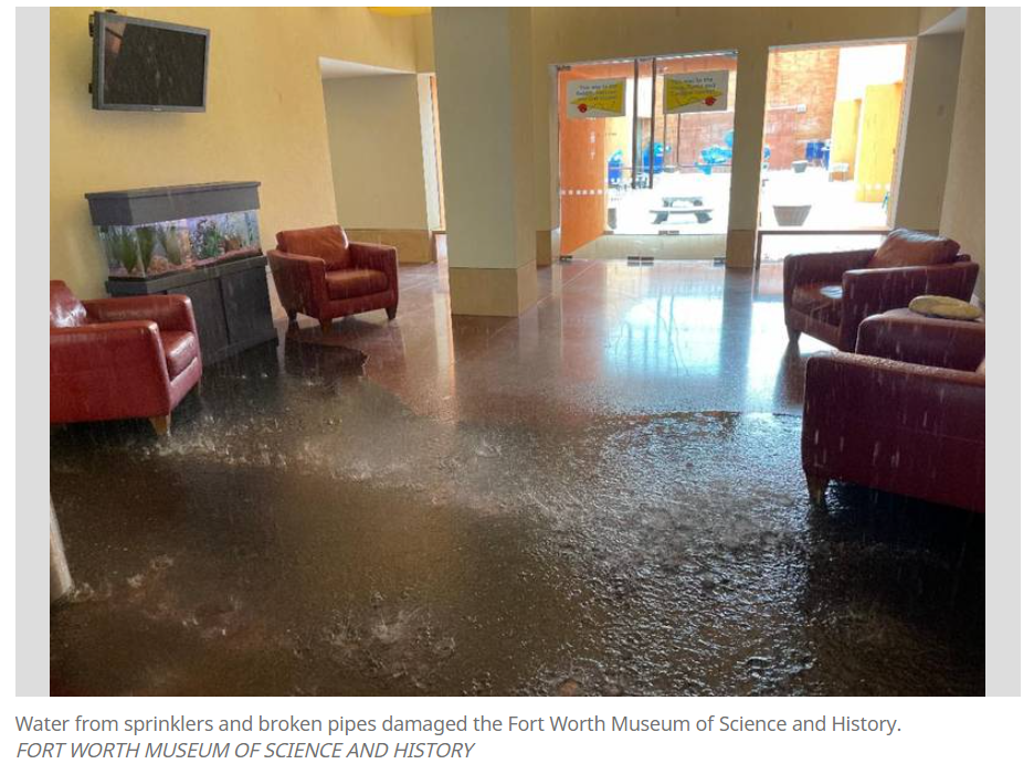 由于德州夏天酷热,许多建筑装有消防喷淋系统,却在这次严寒中被冻坏造成房子内发大水,不少建筑就这样被全毁。
