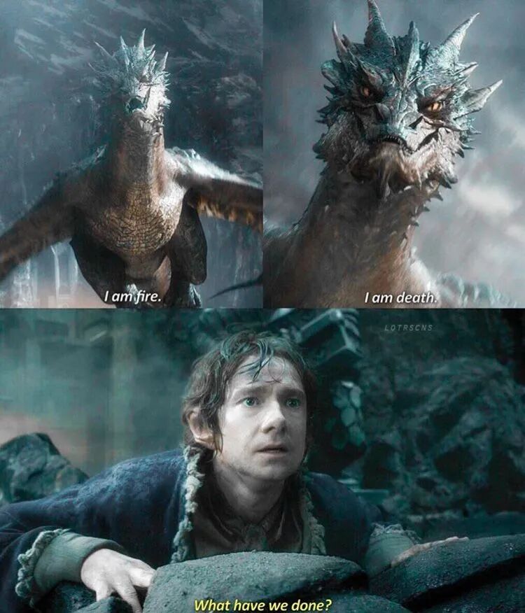 这不禁让人想起电影《霍比特人》(Hobbits)里面的经典场景,当他们无意中释放出来恶龙的时候,只剩一脸惊恐地说:“(天呐)我们干了什么(What have we done)?”