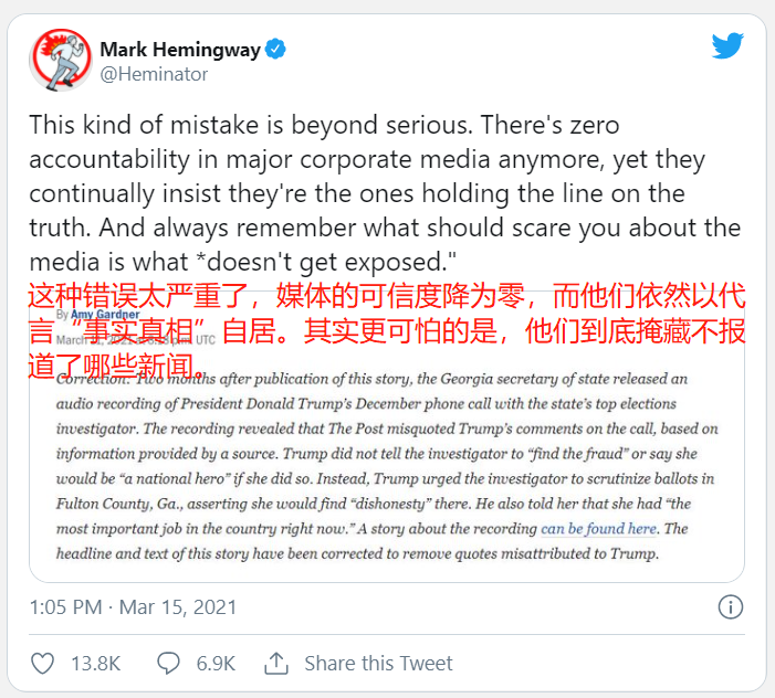 周一,《华盛顿邮报》(简称华邮)发表了一项更正,他们1月9日发的关于乔治亚州(Georgia, GA)大选的一则轰动新闻有明显错误,报道时任总统的川普对乔治亚州选举调查人员所说的话的内容,并非事实。