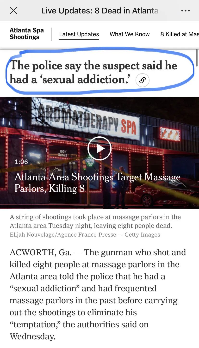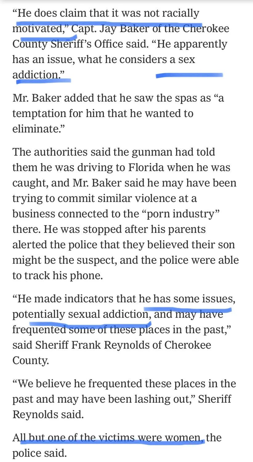 事实上,根据《纽约时报》的最新报道,嫌犯杀手阿隆跟警方交代,自己不是以族裔因素决定杀谁;警察还说他有“性成瘾(sex addiction)”问题,选择的目标都是他光顾过的按摩店。