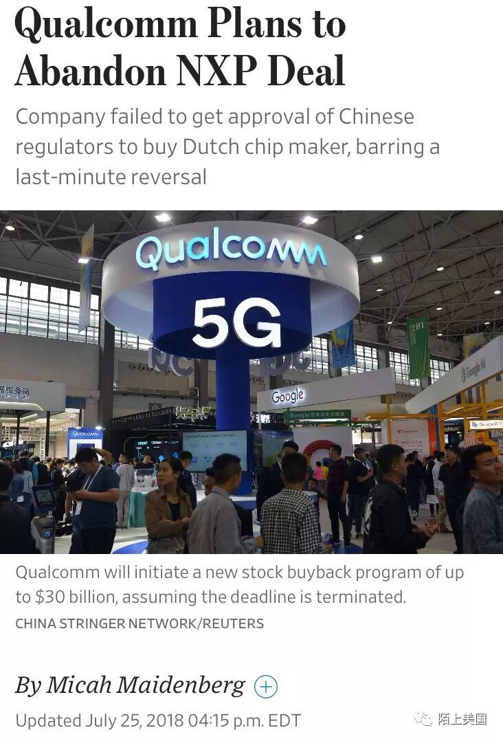 此外,今天同时传来,因为未获得中方协作,美国高通公司计划用440亿美元收购荷兰芯片公司NXP的商谈,在最后关头功败垂成。高通公司因此需要给NXP公司支付20亿美元的违约费。