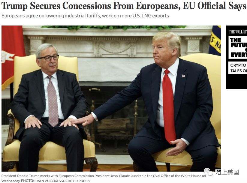 首先,根据CNN和《华尔街日报》的报道,欧盟委员会主席Jean-Claude Juncker(让 - 克洛德·容克)等为首的欧盟代表团于今日会见川普。欧盟同意做出一些让步,以避免与美国发生贸易战。