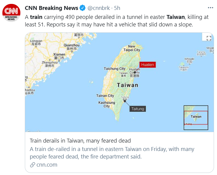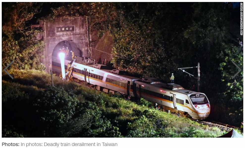 2018年,一列火车在台湾东北部脱轨,造成18人死亡,175人受伤。事故原因是,速度警报系统故障以及驾驶员忙于与指挥中心交谈,导致在进入弯道之前未能及时减速,造成火车脱轨;