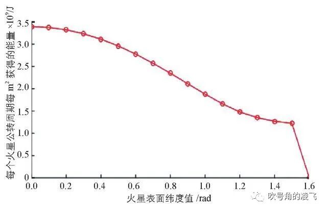 在不考虑沙尘暴的影响下,火星表面不同纬度的太阳能密度如下图: