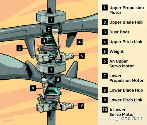 “机智号”使用一对斜盘来控制每个转子的总螺距和周期螺距,不象地球上的直升机那样可以上下挥动的铰链。