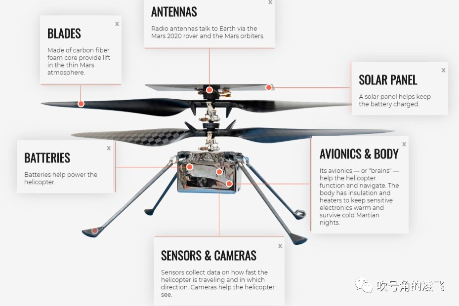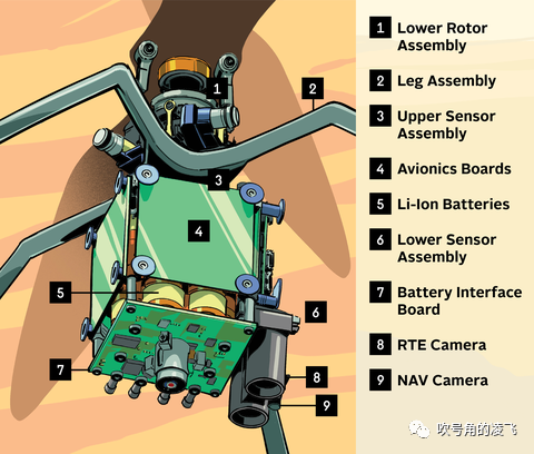 “机智号”的方形机身再加上机身盒子外面的天线、太阳能电池板、着陆脚和两个长度为4英尺(1.2米)的旋翼等组件。