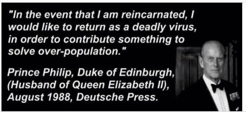 1988年8月,英国菲利普亲王冒出一个神预言,“如果我转世了,我愿以致死病毒的方式重返人间,解决人口过剩危机。”