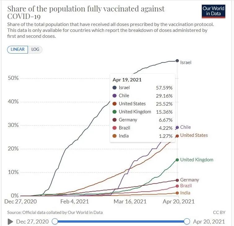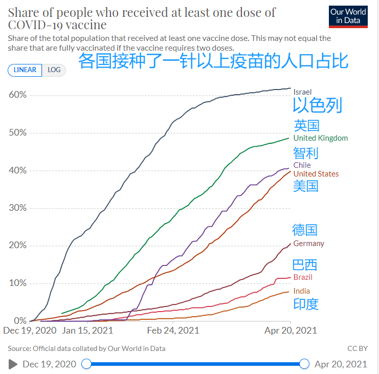 这张图是全球一些国家,接种了至少一针以上疫苗的人口占整体人口比例的数据。其中以色列、英国领先全球,智利、美国紧随其后。