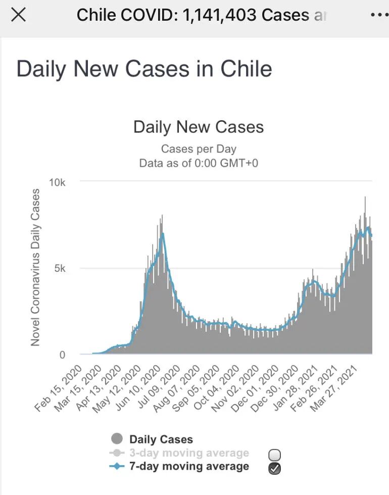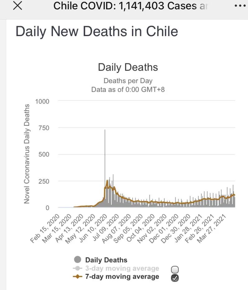 下面则是智利的疫情数据。他们购买的不是欧美研发生产的疫苗,该国也并没有随着疫苗的推广,看到疫情控制上的同步改善。