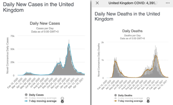 尽管期间出现了新冠病毒英国变株、牛津疫苗因罕见但致命的血栓副作用被临时叫停等问题,但是从7日平均日增感染数据(图左)和7日平均死亡人数(图右)来看,疫苗依然有效缓解了在英国疯狂肆虐的疫情。