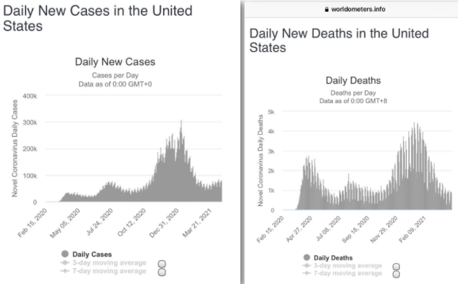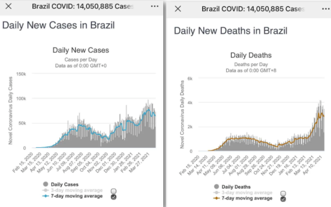 可以看到,在美国开始普及疫苗接种之后,疫情控制上与巴西拉开明显差距。巴西的疫情在恶化,感染率和死亡率走向新的双高,而美国的疫情在显著好转。