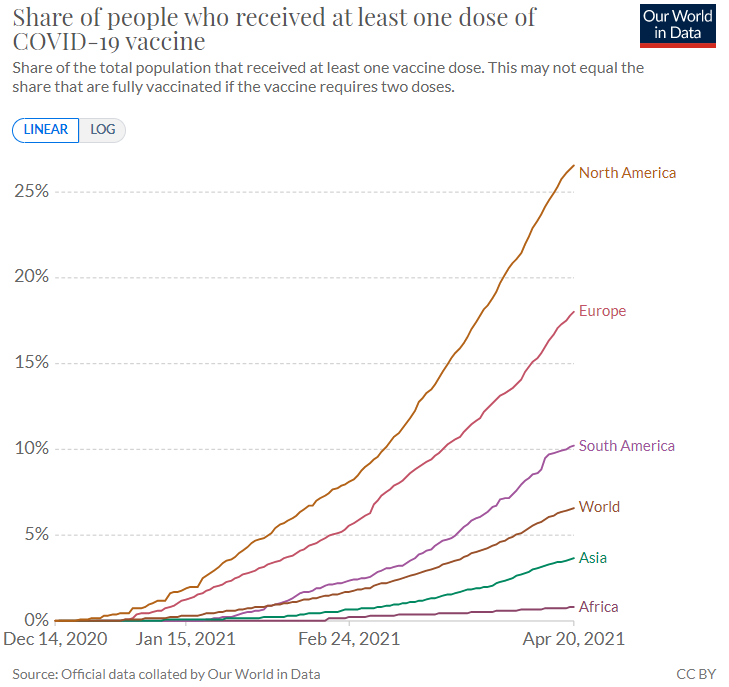具体到不同的大洲,完成了至少一剂疫苗注射的人口数量,以北美洲领先,在26%的水平;