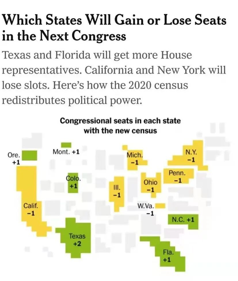 这次美国一共有13个州增加或者减少国会众议院席位,其中德州是最大赢家,唯一增加了2个国会众议院席位的州;而加州在历史上首次出现国会众议院减席。
