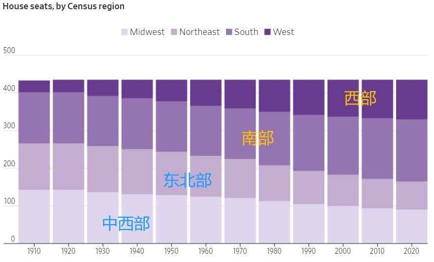 每个州的人口数量,直接影响获得的政治力量的分配,具体就是国会众议院代表席位数量的变化。