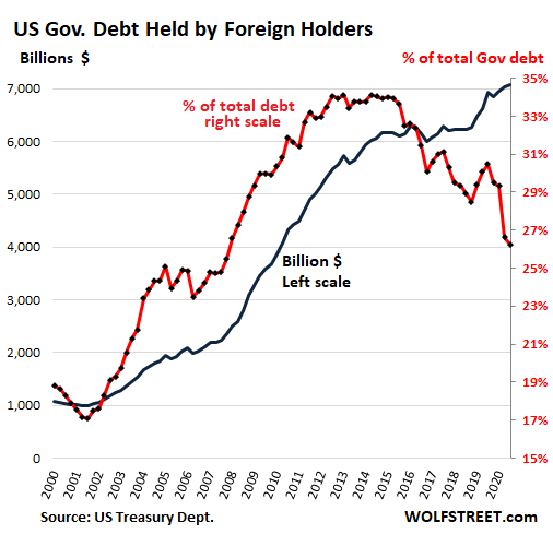 此外有一点不太被人提及的是,美国国债持有方大头来自美国的民间和机构,海外持有的美国国债比例不到30%(红线),而且近年处于下降渠道。本质上是政府向民间借钱,国穷民富的一种现象,属于“内部矛盾”的成分大,国际关系的牵制次之。