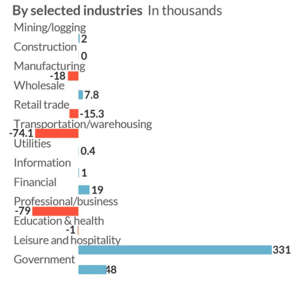 而随着社会关闭的加快解除,饭店、休闲和酒店业增加了33.1万个工作岗位,成为本月工作增长的主要贡献部门;